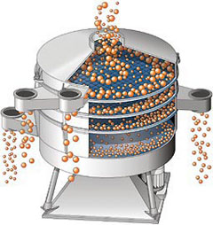 圓振動篩的工作原理為,篩機(jī)起動后,篩機(jī)振動器帶動振動篩箱一同作定向跳躍式運(yùn)動,其間,小于篩面孔徑的物料通過篩孔落到下層,成為篩下物,大于篩面孔徑的物料經(jīng)連續(xù)跳躍動運(yùn)后從排料口排出。完成篩分工作。