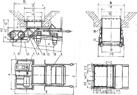 1、減速機(jī) 2、電動(dòng)機(jī) 3、傳動(dòng)平臺 4、聯(lián)軸器 5、H形架 6、連桿 7、給煤槽 8、閘門 9、機(jī)架 10、漏斗 11、托輥